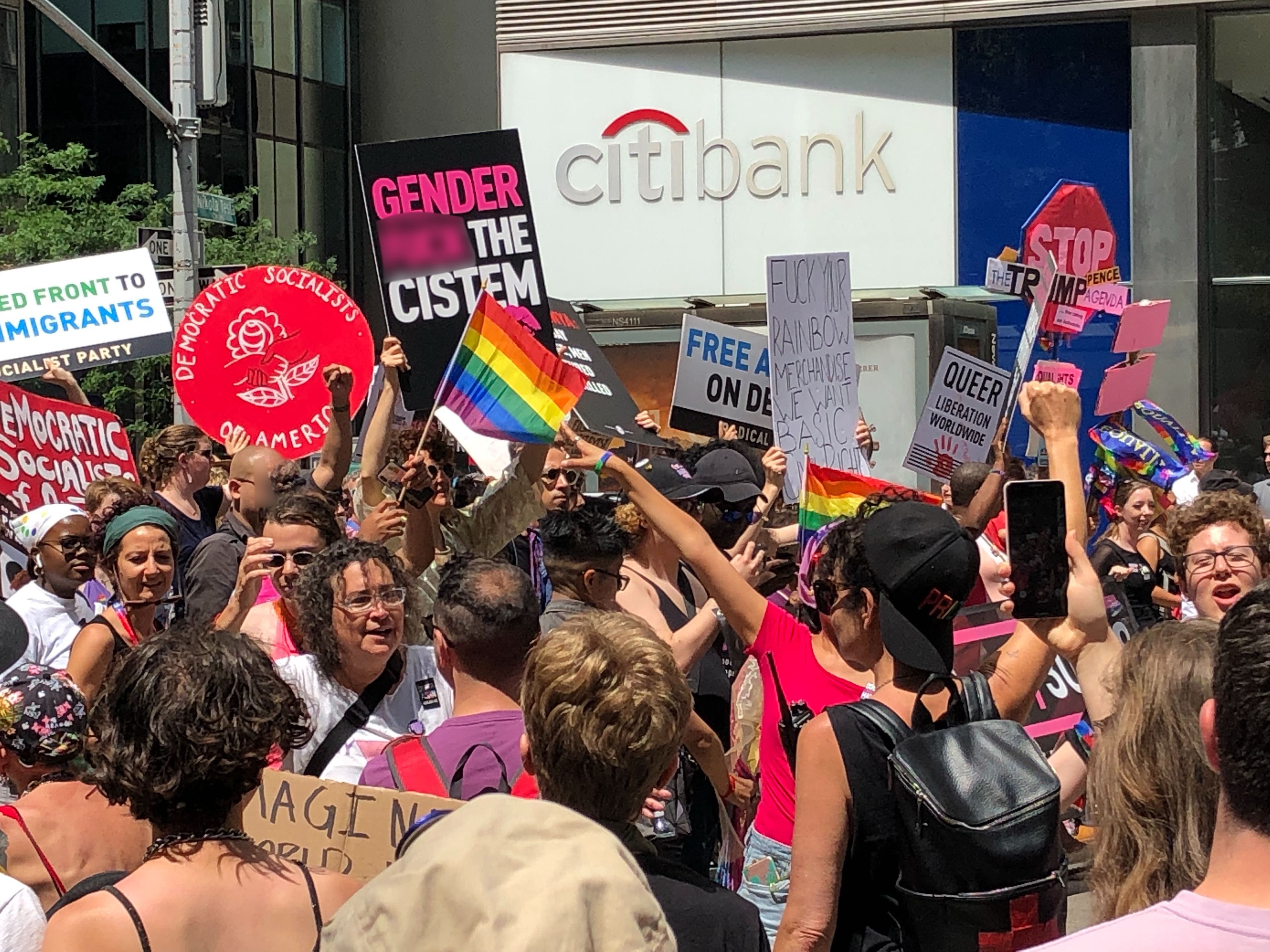 They carried signs that read,“Pride is not for profit,” "F--- your rainbow merchandise" and "F--- straight pride.”