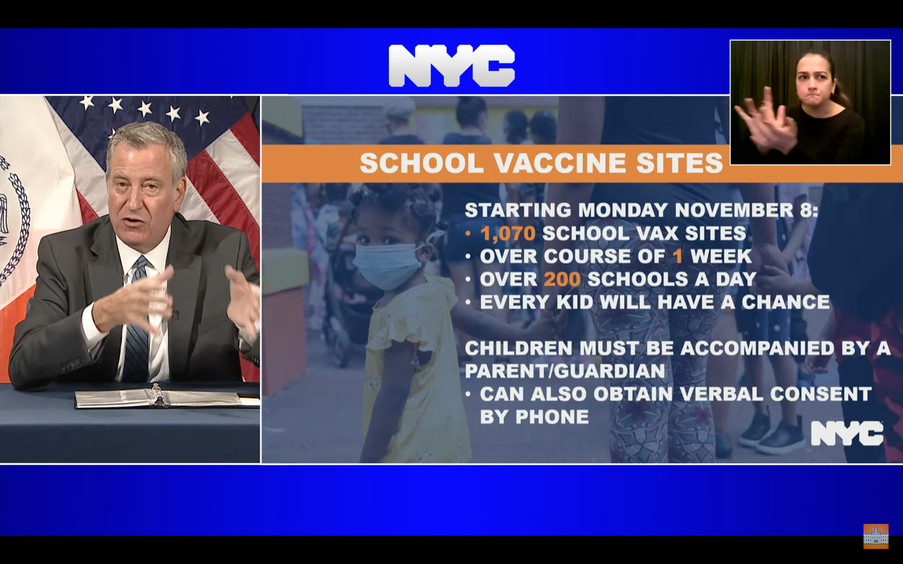 And city officials also will start a week-long vaccination drive Nov. 8 across 1,070 schools, de Blasio announced.
