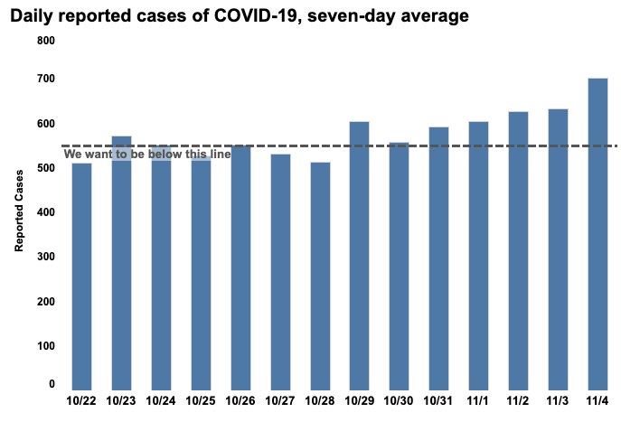 The city’s seven-day average of new COVID-19 cases has ticked above 550 at least nine times since late October, according to data.