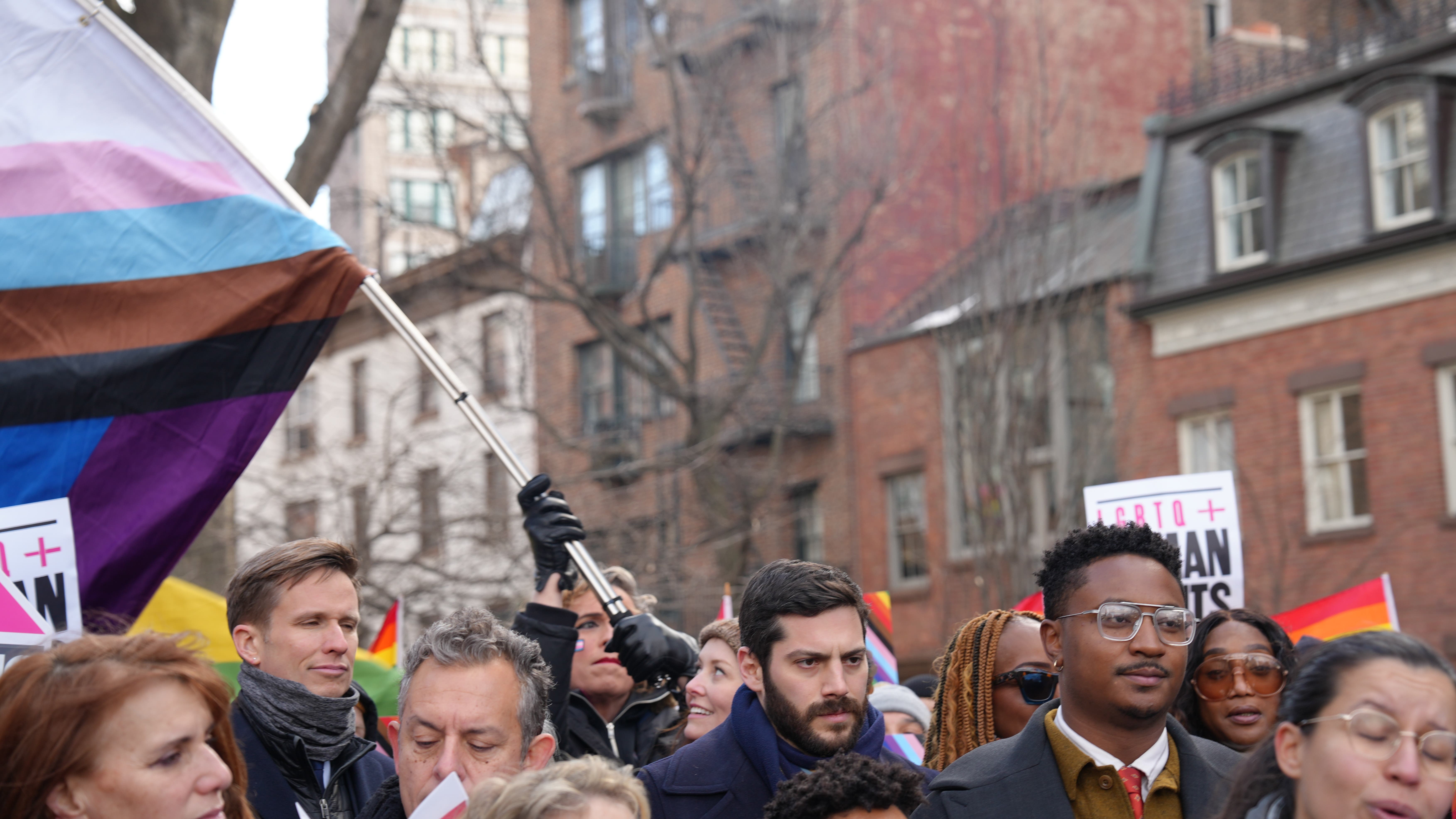 NEW YORK, NY — Chloe Elentari stood beneath the bare flagpole at the Stonewall National Monument on Thursday morning, waving a large Pride flag that could be seen in the back of the crowd of about 75 people at a rally in Greenwich Village.