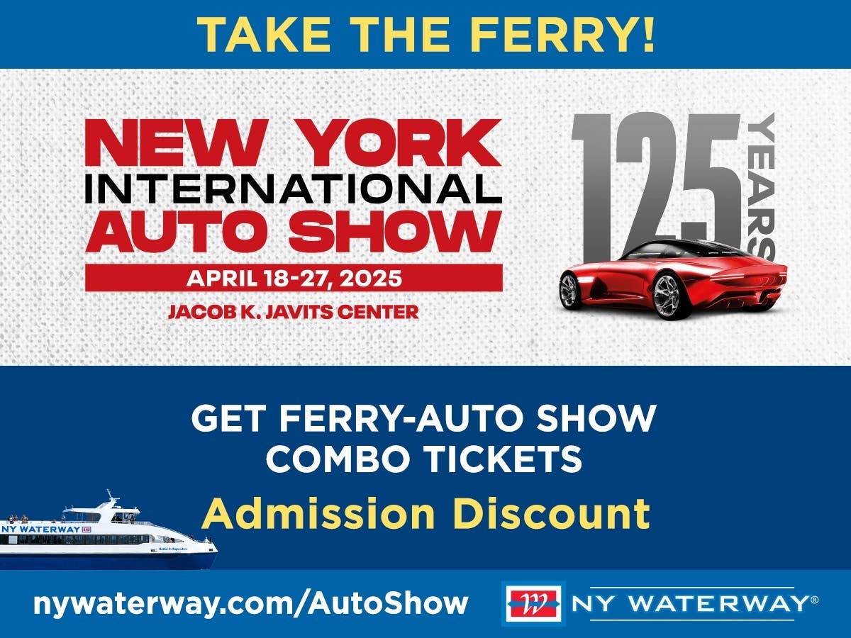 Tuesday, February 18, 2025—The New York International Auto Show returns to the Jacob Javits Center this Spring, and NY Waterway ferries are the fastest, easiest, and most reliable way to get there from New Jersey. The Auto Show and NY Waterway are partnering to offer reduced-price admission for ferry riders as part of a special Ferry/Auto Show Combo Ticket.