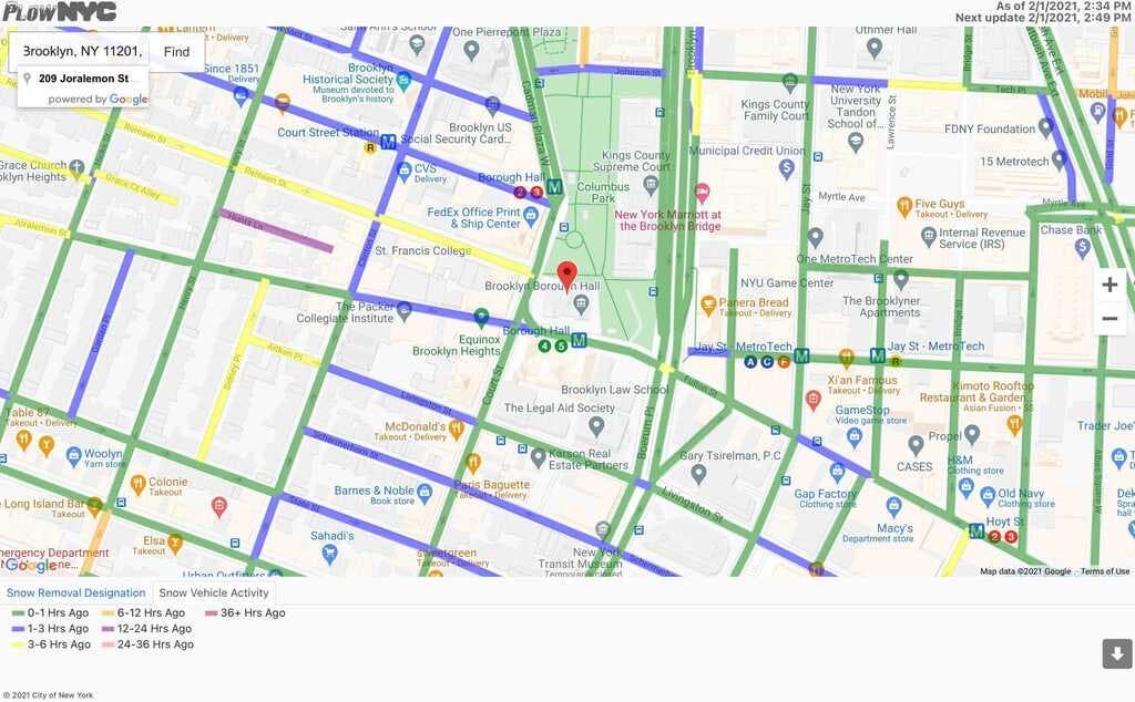 PlowNYC is an online tracker for the city’s plows and spreader vehicles. People can search their street address and find a color-coded result designating when a plow last drove through the roadway.