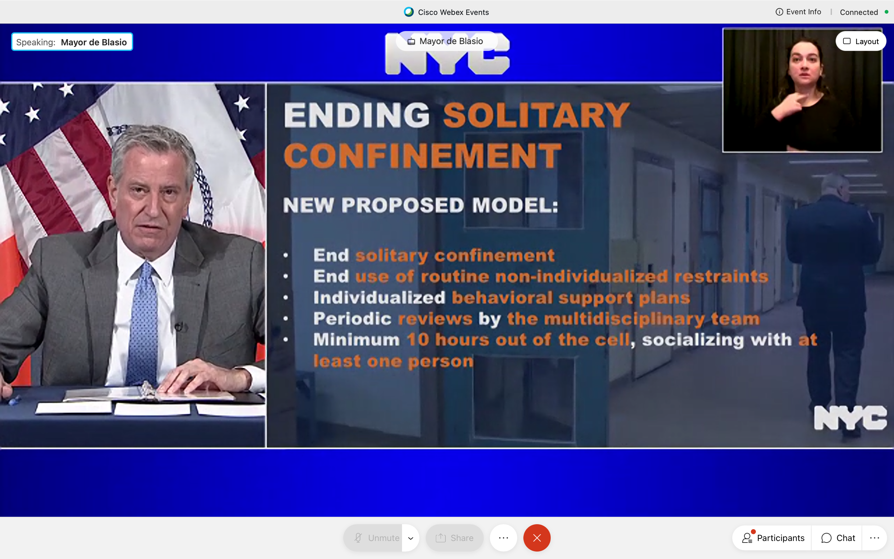 "Working with our Board of Corrections, we've found a plan that will work, that will provide a safe environment for those who are incarcerated and officers alike, but will end the scourge of solitary confinement," Mayor Bill de Blasio said during his daily briefing.