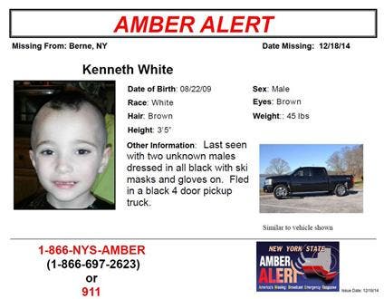 The Albany County Sheriff’s Office has activated the New York State AMBER Alert and is investigating a child abduction that occurred on Thatcher Park Road, in Berne, NY at about 1:20 PMon 12/18/2014.