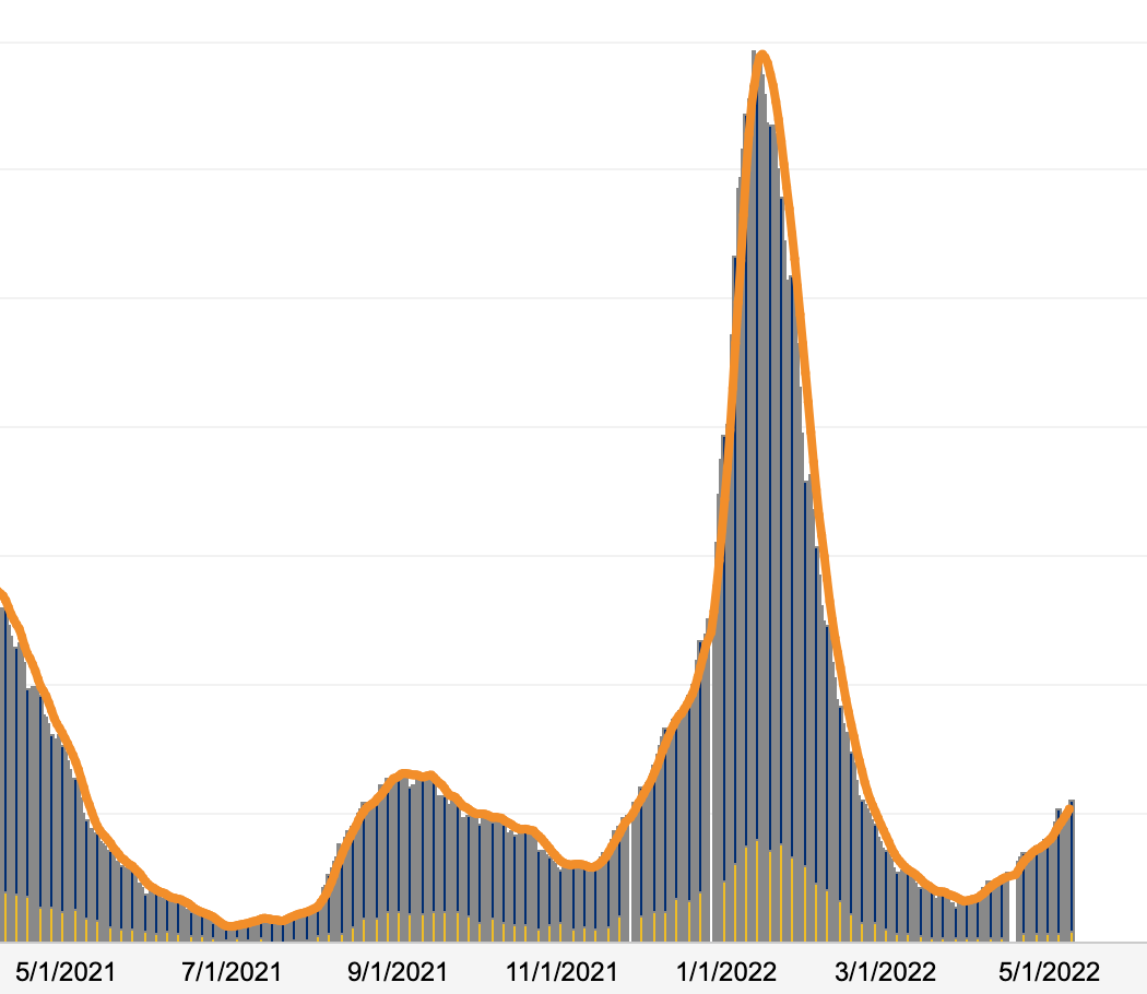 The COVID-19 hospitalization rate in the Hudson Valley, which had bottomed out at the end of the winter surge in late March, has also been rising since then:
