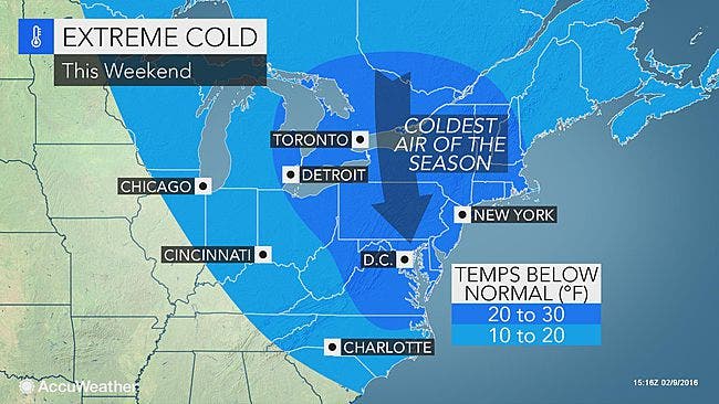 “Occasionally, this storm weakens or shifts enough to allow frigid air to plummet southward into the United States,” said Alex Sosnowski, AccuWeather.com Senior Meteorologist. ”Following a month so far with temperatures averaging 5-10 degrees Fahrenheit above normal, temperatures during Valentine’s Day weekend will plunge to 10-20 degrees below normal. Temperatures will be 30 degrees lower this weekend, when compared to highs at midweek.”