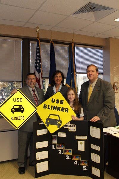 New City 5th grader Casey Zuckerman presented a “use blinker” traffic sign to Supervisor George Hoehmann and Councilwoman Valerie Moldow.