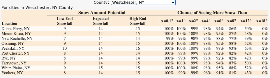 The National Weather Service created charts that show the odds of every community receiving more than 6 inches of snow are almost 100 percent.