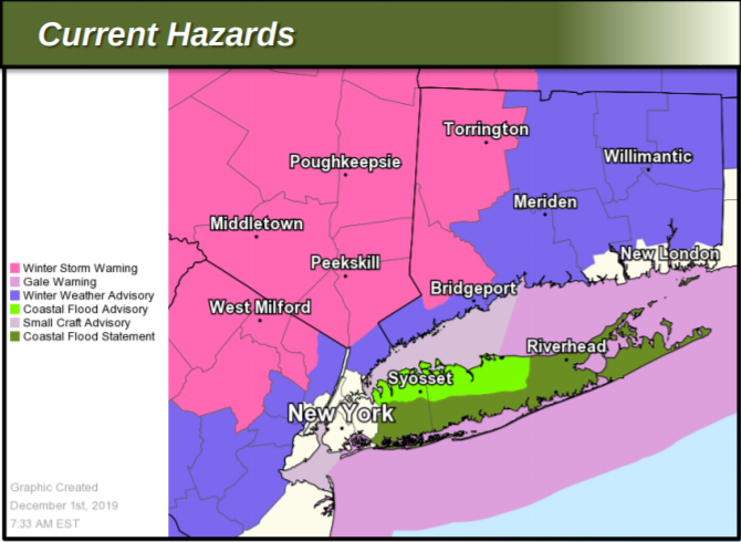 8 a.m. — The National Weather Service has upgraded its predictions for the winter storm bearing down on the region. The NWS issued a warning for all of the lower and mid Hudson Valley except southern Westchester. There's also a gale watch for eastern Long Island Sound.