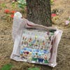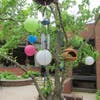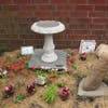 The garden contains a windmill, a fountain, various garden gnomes, and stones decorated by the children. Some of the stones have colored gems on them and others have words like “smile,” “calm,” and “look."