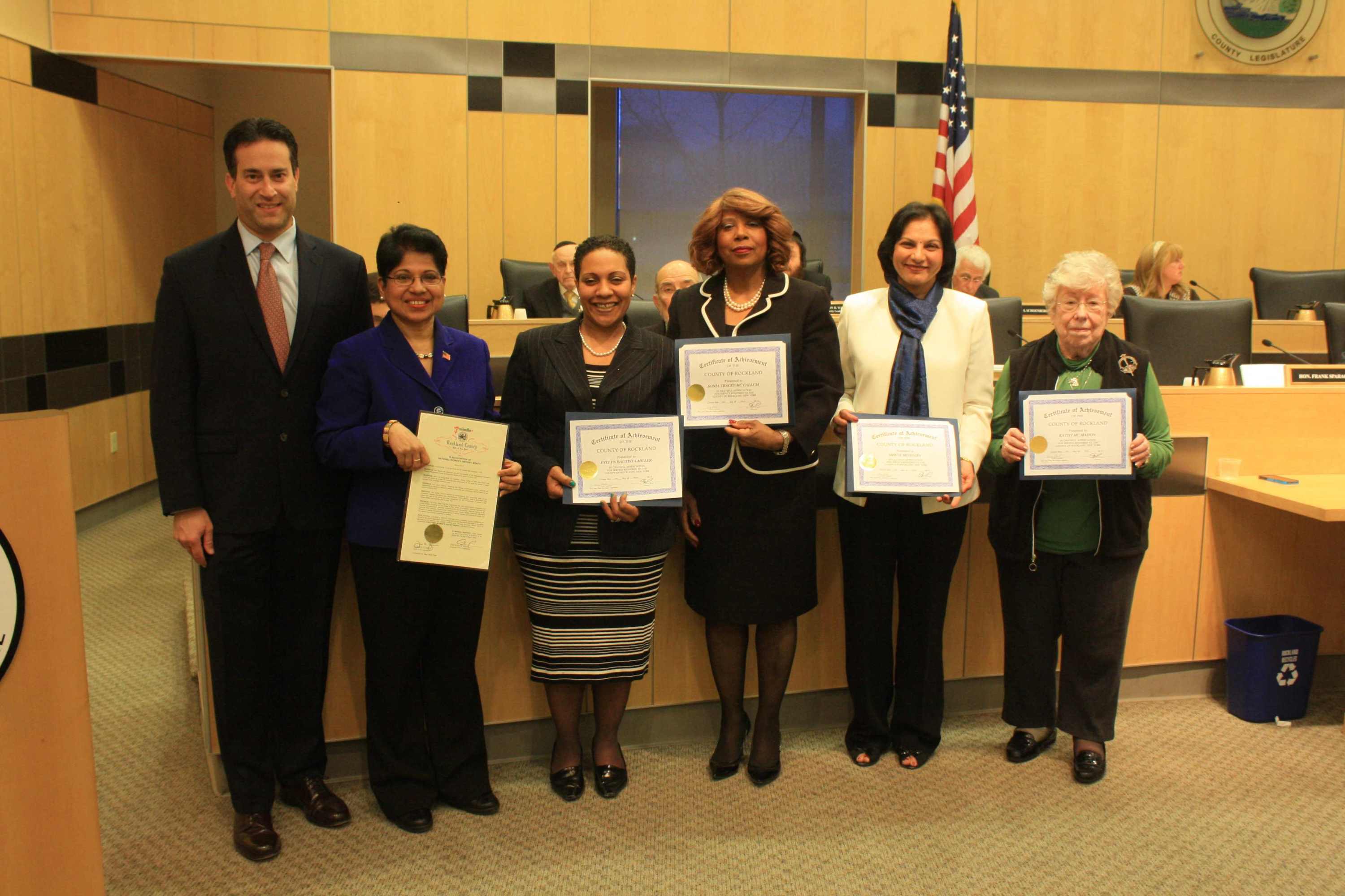 In recognition of National Women’s History Month, Rockland County Legislator Aney Paul paid tribute to four local women of diverse backgrounds who dedicate themselves to community and volunteer services that enrich the lives and well-being of others. The annual month-long national recognition, coordinated by the National Women’s History Project, celebrates and promotes the achievements of women in all facets of life – science, community, government, literature, art, sports, medicine and has made a huge impact on the development of self-respect and new opportunities for girls and young women. Legislator Paul presented the women with Distinguished Service Awards during a ceremony held prior to the Tuesday evening meeting of the Legislature.