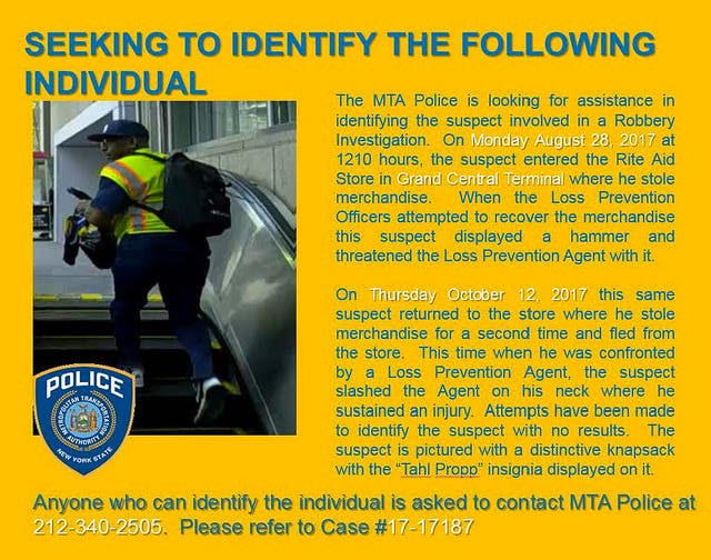 Anyone with information about this robbery suspect is asked to contact the MTA Police at: 212-340-2505, and reference: case #17-17187