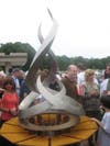 Berger spoke to the assembled crowd outside. The sculpture was donated by Ilse and John Lang, Bonnie and Alan Elkin, and Ellen and Arthur Wagner. John Lang, Alan Elkin, and Arthur Wagner addressed the crowd, as did retired Israeli Brigadier General Yehuda Halevy. Eric David Laxman, who sculpted the statue, introduced the work of art. The sculpture by Eric David Laxman is of an abstract flame; surrounding the base of the flame are the names of the Munich 11.