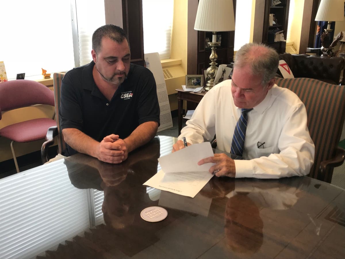 Ed Day signed Executive Order 6 of 2018 with Rockland County CSEA Local 844 President Chris Vogel in his office in New City. County Executive Day said, “it is extremely important to protect the privacy and safety of our public employees. This Executive Order clearly shows the steps we are taking here in Rockland to formalize what has for years been our unwritten policy, guaranteeing the privacy of our hard-working employees.”