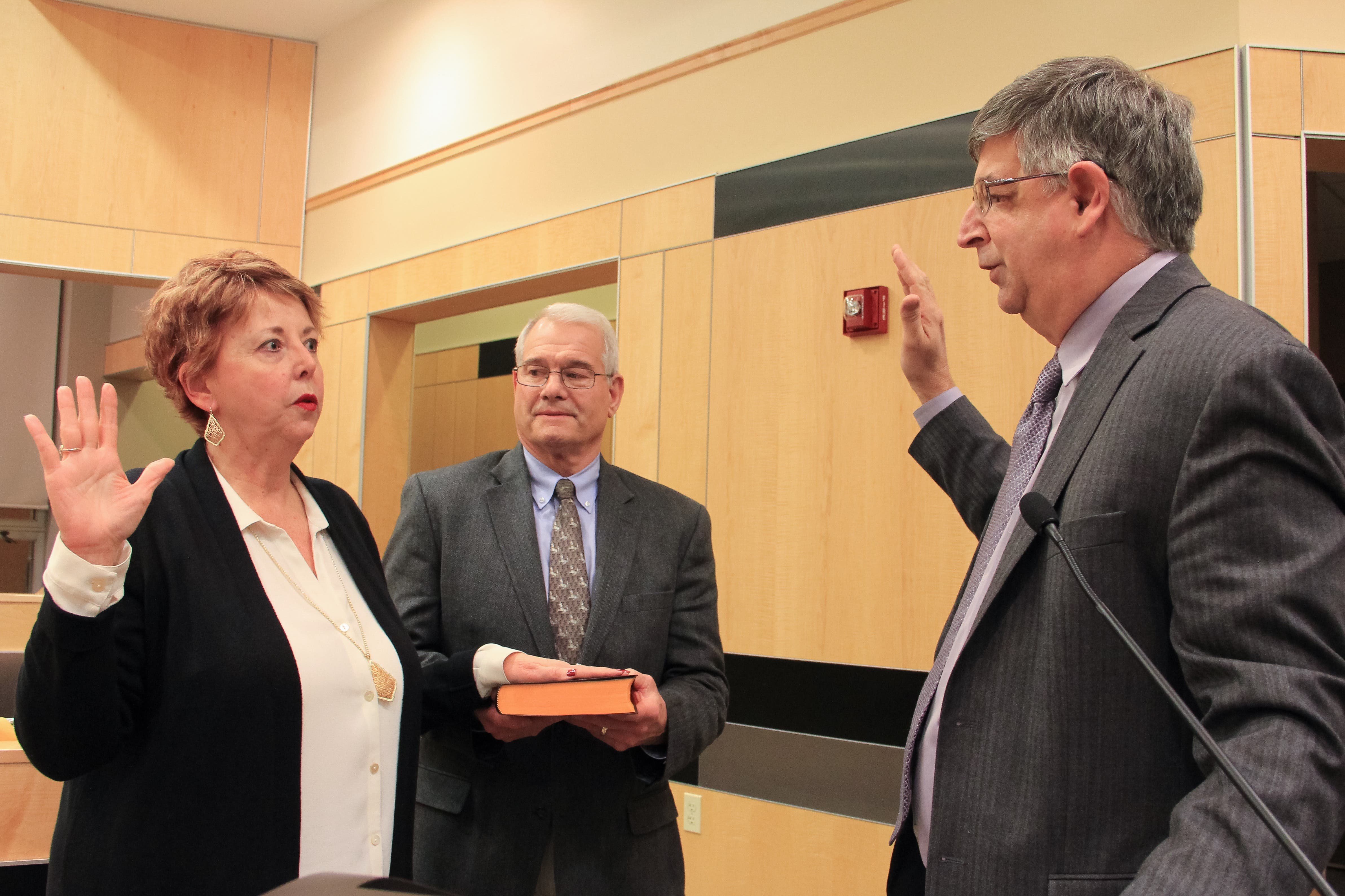 Legislator Nancy Low-Hogan is sworn in as Vice Chair of the Rockland County Legislature by County Clerk Paul Piperato. Her husband, Michael Hogan, joined her at the podium.