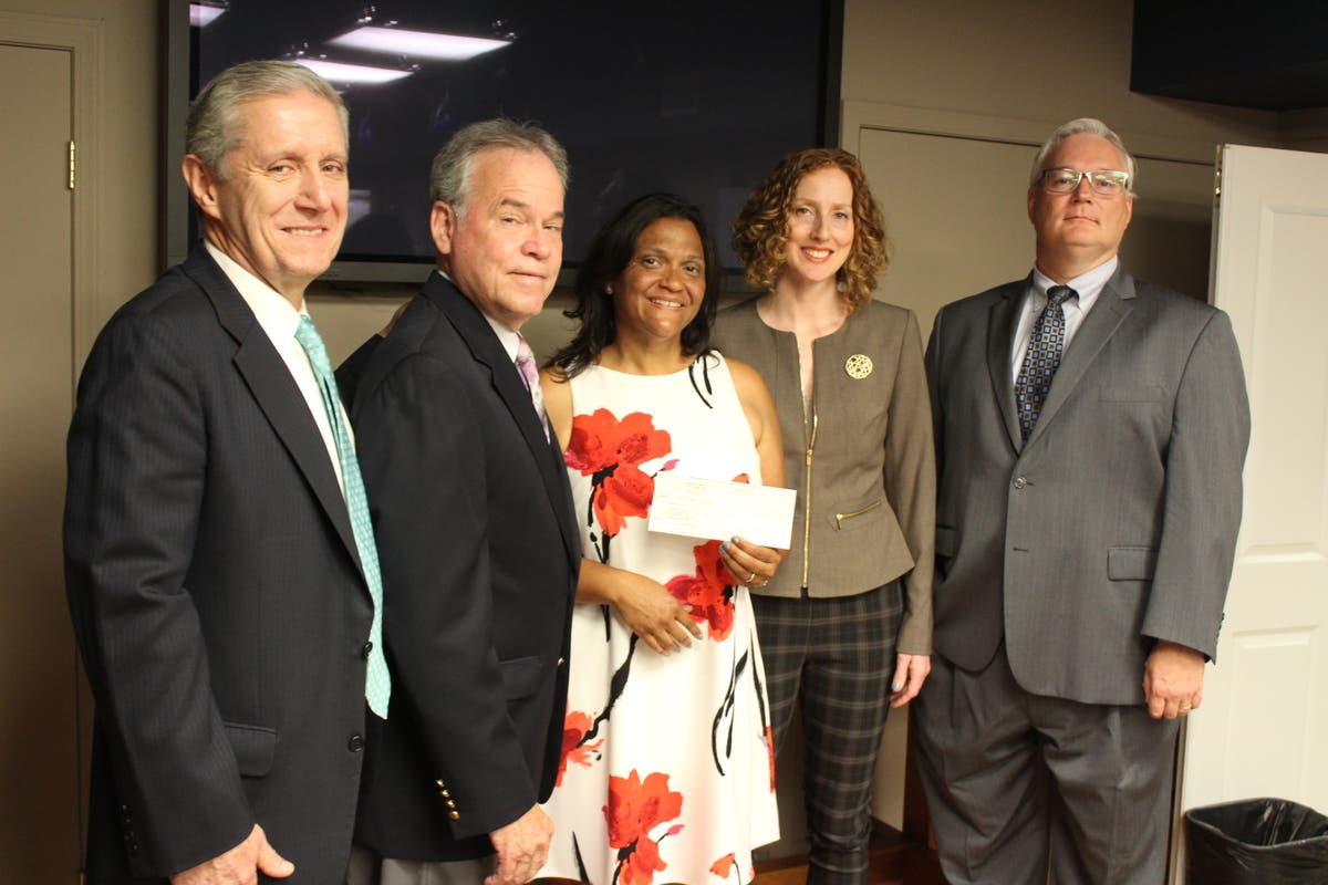 PHOTO: District Attorney Tom Zugibe, County Executive Ed Day, Center for Safety and Change Executive Director Elizabeth Santiago, CSC Deputy Executive Director Amy Siniscalchi and County Attorney Tom Humbach pose with the $10,000 donation check. / Rockland County Executive's Office
