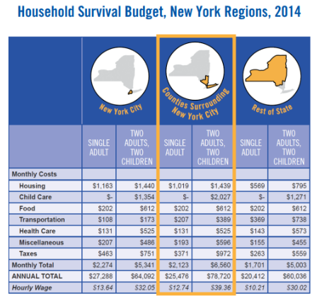 About 44 percent of working New Yorkers struggle to make ends meet, according to the report. Referring to those who are asset limited, income constrained and employed, ALICE’s researchers used demographic and cost-of-living statistics from 2014 to determine what an average New York household income must be to afford basic necessities.