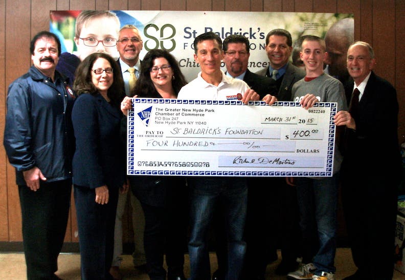 The New Hyde Park Chamber of Commerce presented a check for $400 to St. Baldricks Foundation, a volunteer charity that funds cancer research for kids.