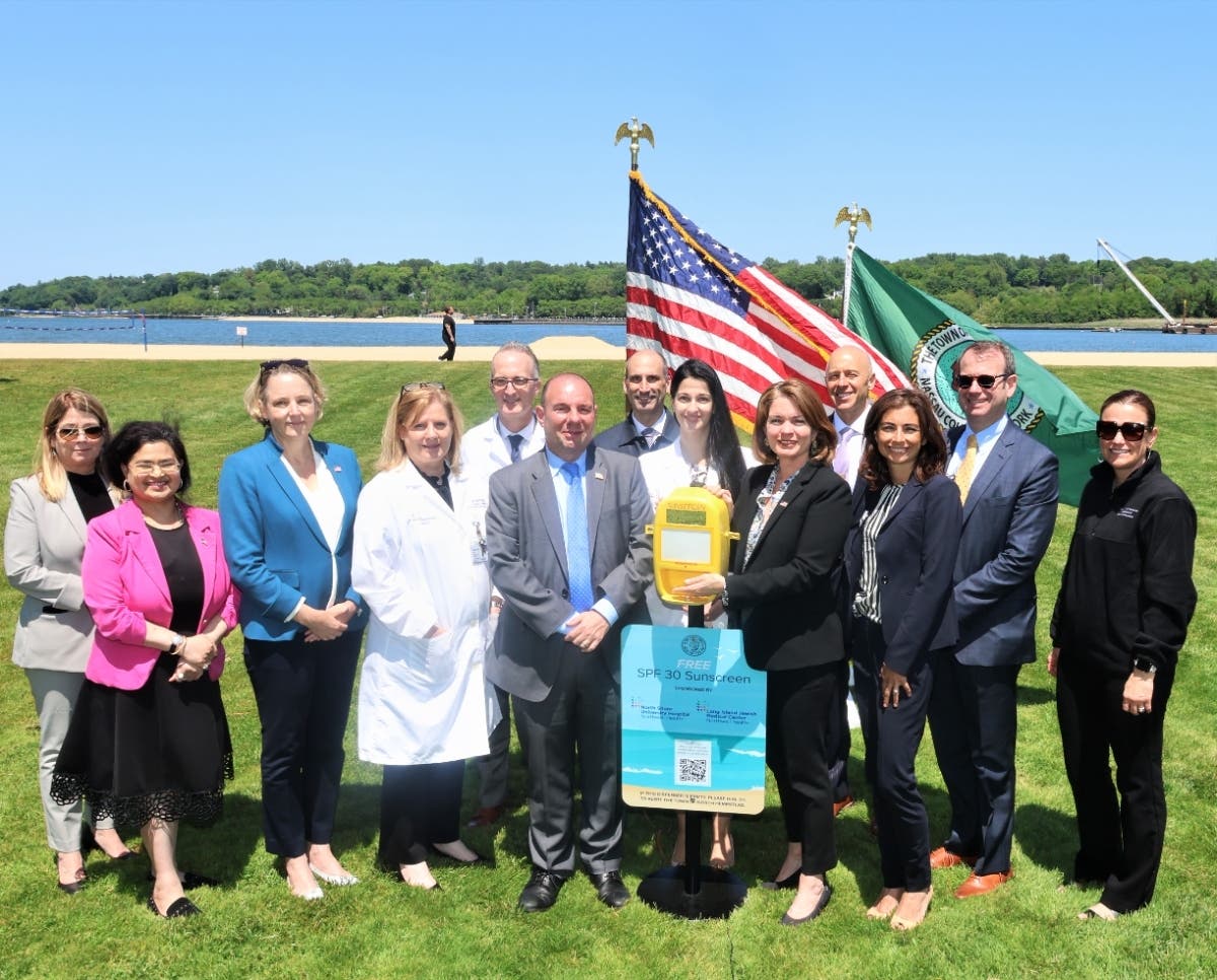 Officials from Northwell Health and the Town of North Hempstead announced today that free sunscreen will be available at Town parks facilities this summer thanks to a partnership with North Shore University Hospital in Manhasset and Long Island Jewish Medical Center in New Hyde Park. The SPF 30 sunscreen, which will be in dispensers at more than a dozen beaches, pools, playgrounds and sports facilities throughout the Town of North Hempstead, was donated by the two Northwell hospitals to help combat a rise in skin cancer diagnoses. In addition to the sunscreen, the hospitals will hold six “Wellness Wednesday” events at various locations throughout the Town to educate residents about key healthcare topics. The initiative is intended to provide Town residents and visitors with advanced access to resources and information to stay safe and healthy year-round.