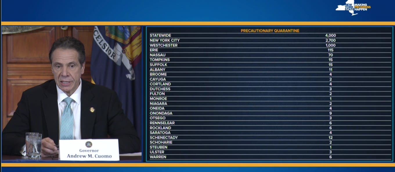 At noon, Cuomo said, 44 people were under mandatory quarantine across the state: 33 in Westchester, nine in New York City and one each in Nassau and Erie.