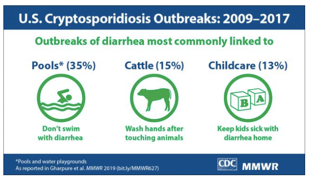The CDC said 35 percent of outbreaks of cryptosporidiosis were linked to treated swimming pools and water playgrounds from 2009 to 2017, the latest year for which data are available. Crypto outbreaks increased annually at an average rate of 13 percent, and nearly 7,500 people were sickened in 444 Crypto outbreaks. Although cryptosporidiosis is almost never fatal, one person died during the period and 287 others required hospitalization.