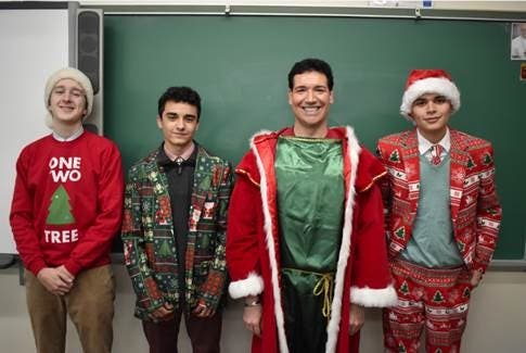 One of the newer Christmas traditions at Iona Preparatory Upper School is Santa Hat & Ugly Sweater Day, when students are encouraged to don some U-G-L-Y, “they ain’t got no alibi” hats, sweaters and in some cases, two-piece suits in a unique sharing of the Christmas Spirit. Prizes were awarded to the best…err, worst-dressed students and teachers. Pictured above, sophomores Patrick Cambria, Nicholas Belluccio and Dennis Bogdanowicz join English and foreign language teacher Christopher “Father Christmas” Minio in making their case.