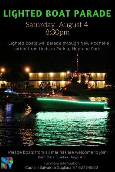 NEW ROCHELLE, NY — The annual Lighted Boat Parade will take place Saturday, Aug. 4 in New Rochelle The lighted boats will sail through New Rochelle Harbor from Hudson Park to Neptune Park.