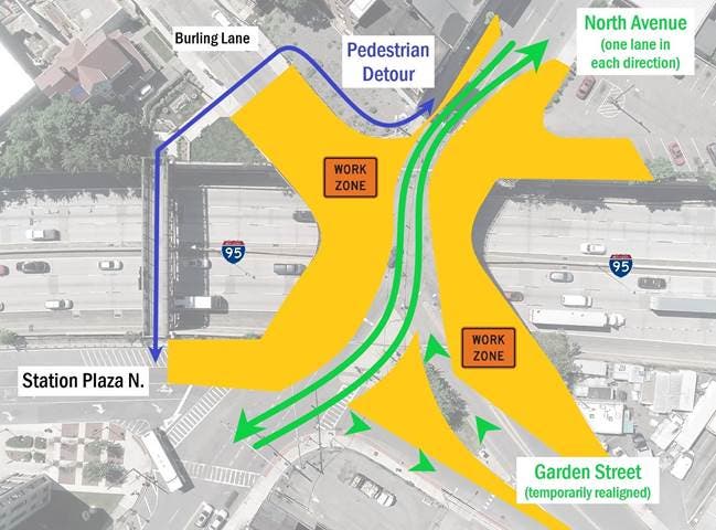 - Pedestrian/bicycle traffic will use the walkway over I-95 connecting at Burling Lane and the train station throughout the project.