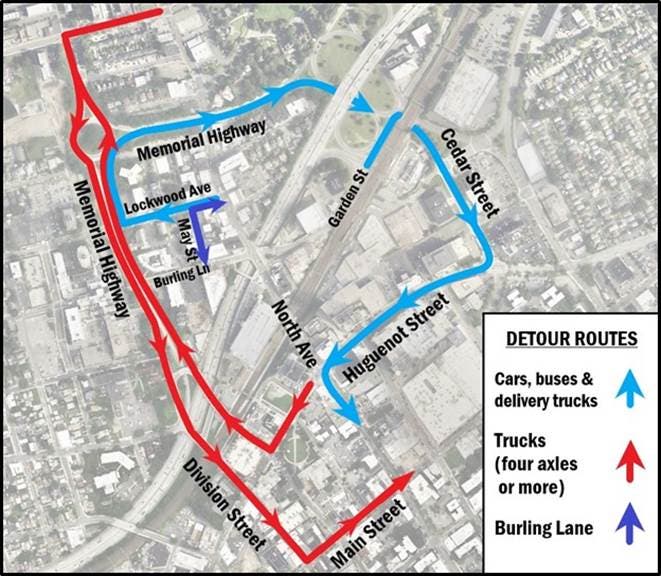 - Left turns from Garden Street to North Avenue are prohibited; a detour will be provided using Cedar Street to Huguenot Street.