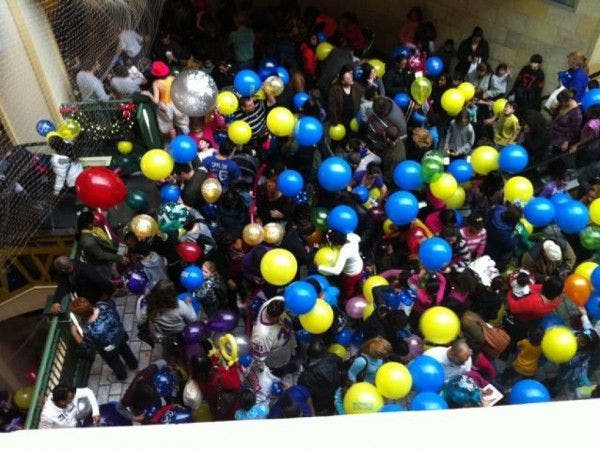 More than 1,500 kids and parents witnesses the noon-time drop of 3,000 colorful and festive balloons which fell from nets attached to the railings of the atrium.