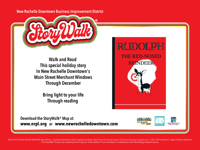 The Storywalk book, "Rudolph the Red Nosed Reindeer," by Robert May, is now in 17 Main Street business windows. This year’s book has a particularly special meaning because the author lived and wrote the book in New Rochelle and was honored with an event and a plaque in Downtown’s Walk of Fame at Ruby Dee Park on Dec. 4.