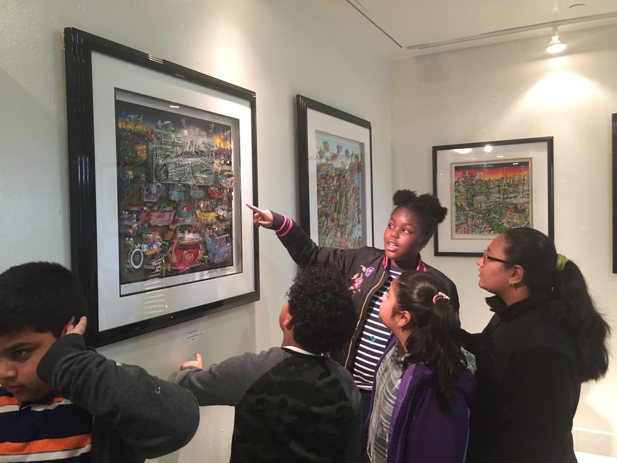Photo caption: Trinity fifth-grader Sameira Brown (pointing) discusses a Fazzino work with classmates. Photo credit: NRED.org.
