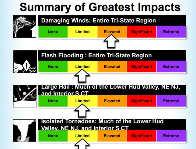 "We have an elevated risk of strong to severe thunderstorms Tuesday afternoon," said Bill Potter and Alex Marra of Hudson Valley Weather, adding their prediction that the National Weather Service will expand its “Enhanced Risk” designation to the whole region.