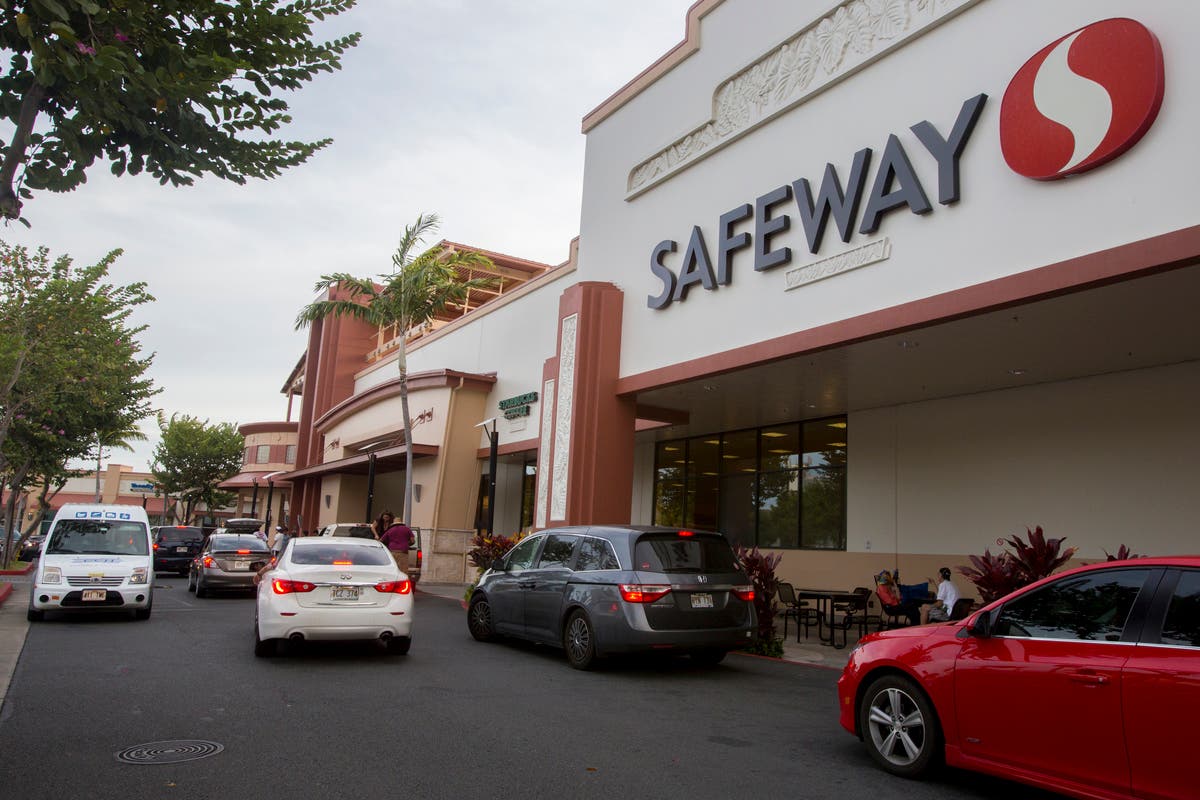 The lot of this Safeway market on Kapahulu had lines of cars just waiting to get parking due to so many people attempting to stock up on essential supplies. (Photo by Kat Wade/Getty Images)