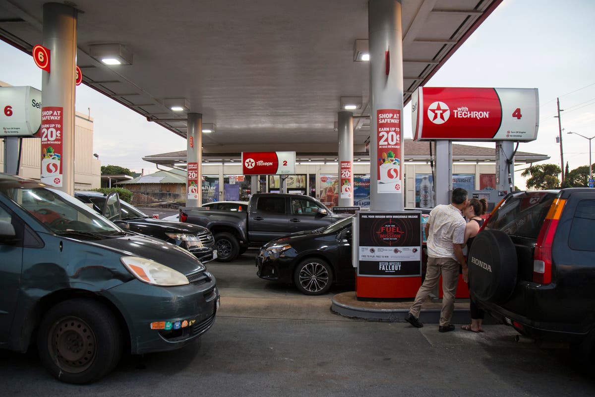 Continuous lines of vehicles also filled local gas stations in preparation for the storm's possible impact, as seen at this Texaco station on Harding Avenue. (Photo by Kat Wade/Getty Images)