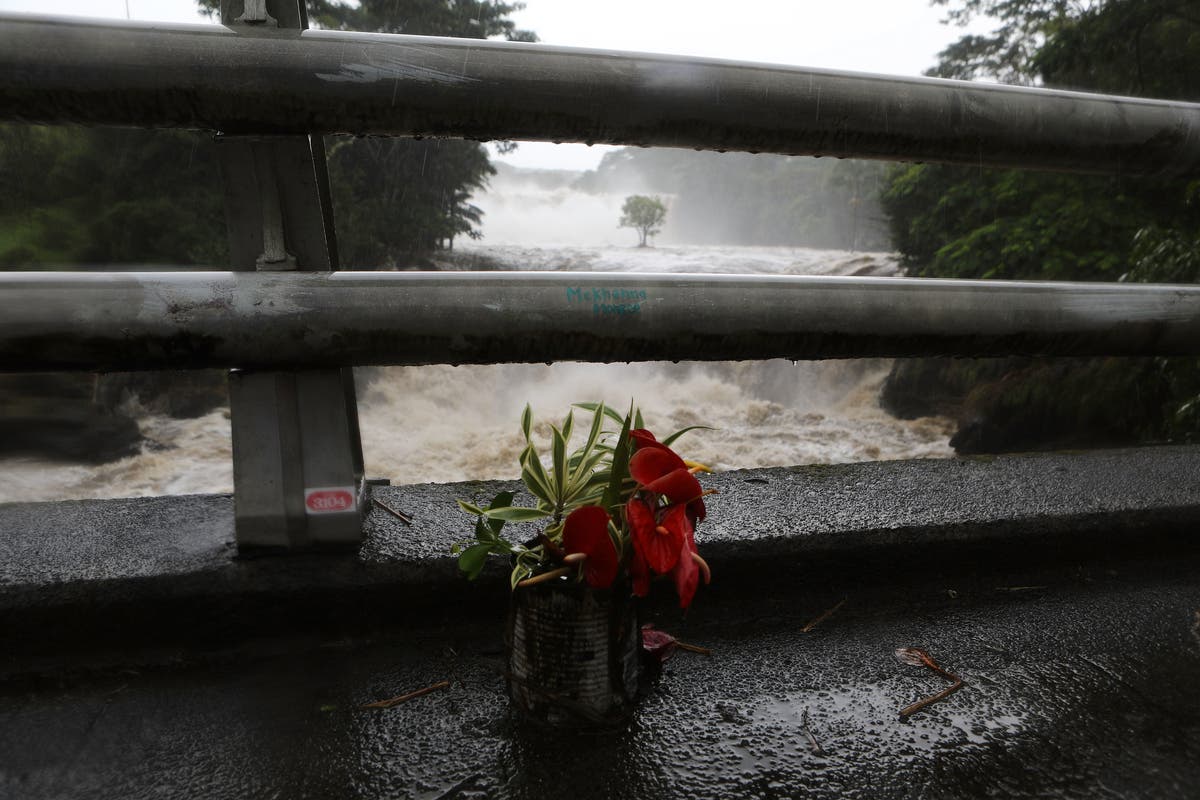 Some locals paid tributes to the devastation as seen here by flowers left on a bridge above the Wailuku River flood waters. (Photo by Mario Tama/Getty Images)