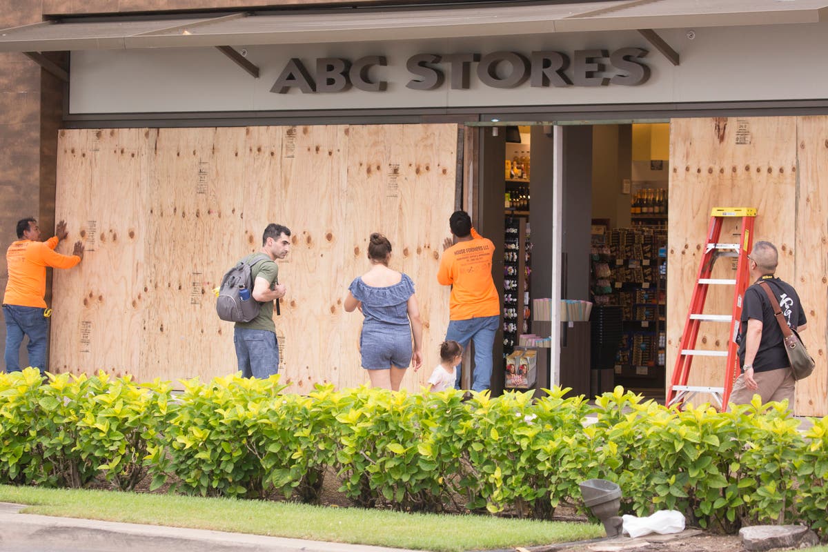 Despite the carefree attitude of many, other locals spent time bracing for the storm's racing rainfall. Workers can be seen boarding up a local ABC Store in Honolulu after Big Island was lashed with nearly 20 inches of rain. (Photo by Kat Wade/Getty Images)
