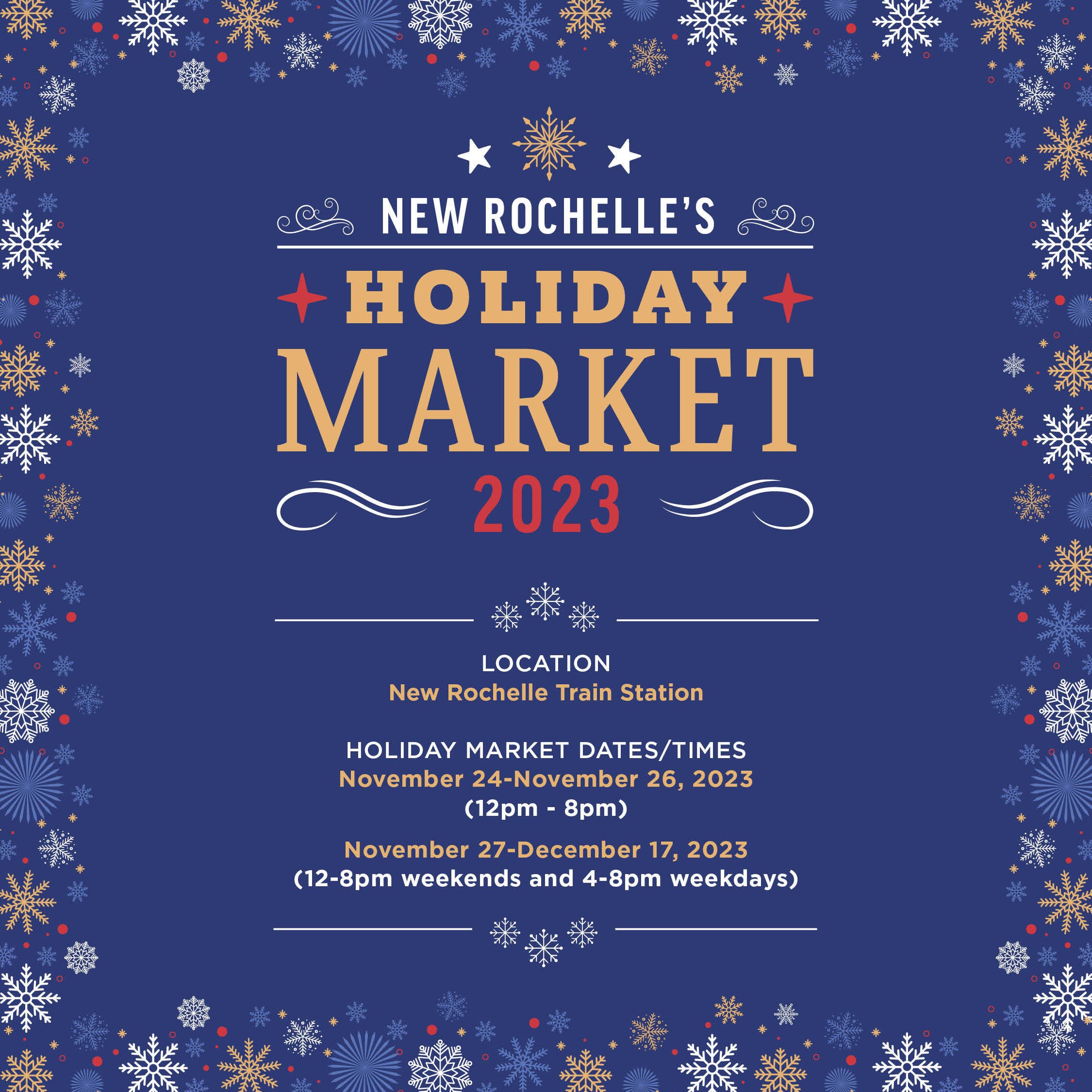 The 2023 Holiday Market will take place at the New Rochelle Train Station at Station Plaza North from November 24 to December 17 and will operate from 4 p.m. – 8 p.m. on weekdays and Noon – 8 p.m.on weekends. All are welcome. Free 2-hour parking is available in the train station garage.