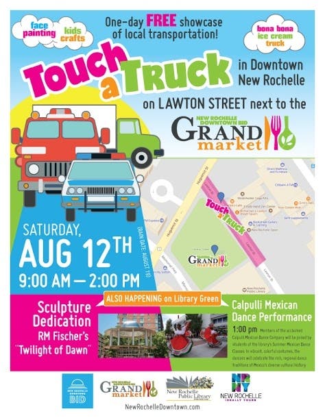 NEW ROCHELLE, NY — Children and families will be able to explore a fire engine, ambulance and other specialty vehicles on Touch-a-Truck day at the August 12 New Rochelle downtown Grand Market, an event that will also be enlivened by colorful Mexican dances and the dedication of a sculpture by nationally prominent artist R.M. Fischer. The events are part of the market held Saturdays from 9 a.m. to 2 p.m. in Ruby Dee Park at Library Green on Huguenot Street from Lawton Street to Memorial Highway.