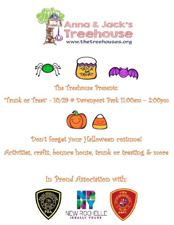 NEW ROCHELLE, NY — New Rochelle children will be able to celebrate Halloween safely thanks to Anna & Jack’s Treehouse, in association with the city, the New Rochelle PBA and New Rochelle Fire Department. The “Trunk or Treat” event will be held from 11 a.m. to 2 p.m. Oct. 29 at Davenport Park in New Rochelle.