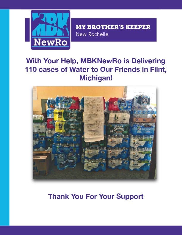 NEW ROCHELLE, NY - My Brother’s Keeper New Rochelle reported that 110 cases of water were donated Feb. 20 and 21 for the City of Flint.