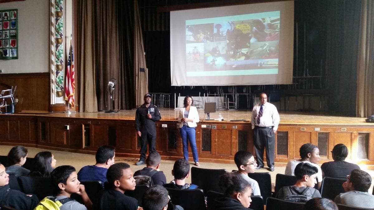 NEW ROCHELLE, NY — The youngest person to fly solo around the world — and the only black person to do so — visited Isaac E. Young Middle School in New Rochelle Tuesday to meet with seventh and eighth graders.