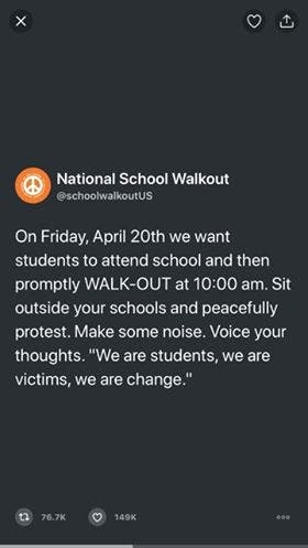 The April 20 national walkout, takes place on the 19th anniversary of the Columbine shooting, at 10 a.m. in time zones across the United States. The event also has a Change.org page, "National High School Walk-Out for Anti Gun Violence," and a goal of garnering 150,000 signatures on a petition. For updates on the event, check Twitter. Students are asked to walk out of school, wear orange, and raise their voices online and in local communities.