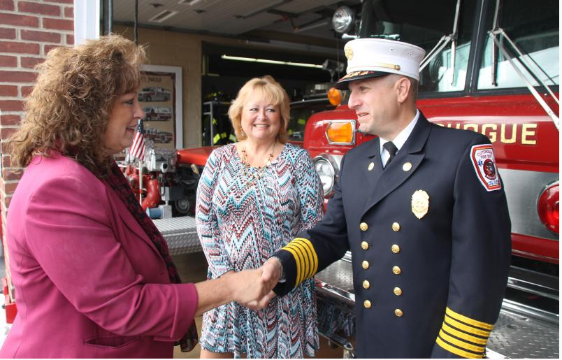 Photo Caption: Diane Biondi (left) shakes hands with Cutchogue Fire Chief Bill Brewer after she, Patty Stewart, and David McDowell (not pictured) gave him a $2,000 donation.