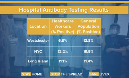 In New York City, 12.2 percent of health care workers tested positive for the antibodies, compared to 19.9 percent of the general populations. And in Westchester, 6.8 percent tested positive for antibodies, with 13.8 percent of the general population testing positive.