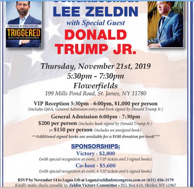 SUFFOLK COUNTY, NY — Donald Trump Jr. is reportedly slated to attend, as a special guest, a fundraiser for Rep. Lee Zeldin, who is running for re-election for his seat in New York’s 1st Congressional District in 2020.