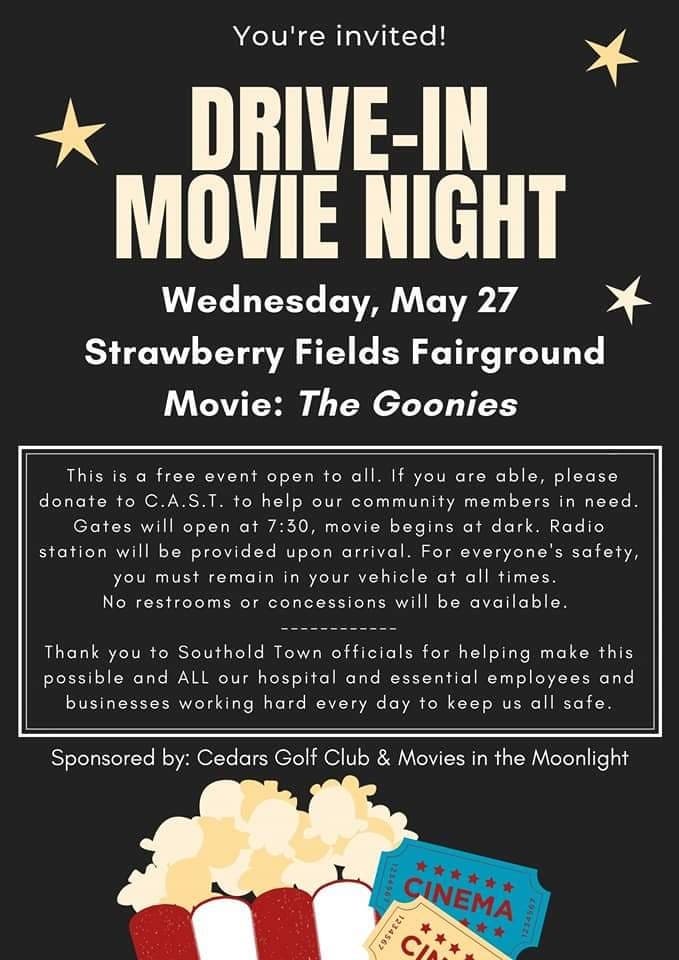 On the North Fork, a drive-in movie night, with a showing of "The Goonies," is planned for Wednesday, May 27, at the Strawberry Fields fairground, located at 1175 Middle Rd. in Mattituck. Gates open at 7:30 p.m.; the movie begins at dark. While the event is free, donations will be accepted for Community Action of Southold Town to help those in need.