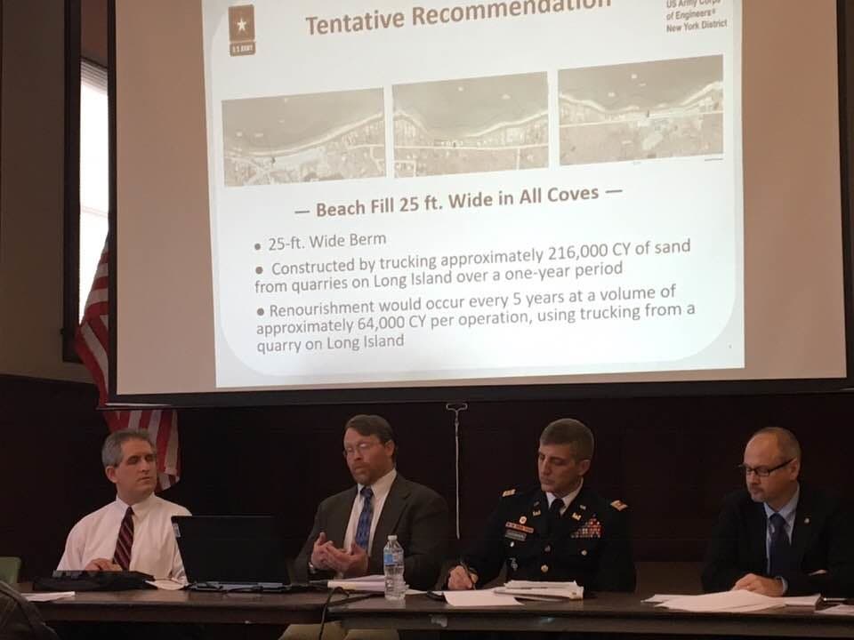 Couch gave a background of important project dates beginning in 2014, then gave the ACOE's tentative recommendation, which would be a beach fill, with a 25 ft. wide berm in all coves, constructed by trucking in approximately 216,000 cubic yards of sand from quarries on Long Island over the course of a year. Renourishment would then take place every five years at a volume of approximately 64,000 cubic yards per operation, using trucking from a quarry on Long Island, he said.