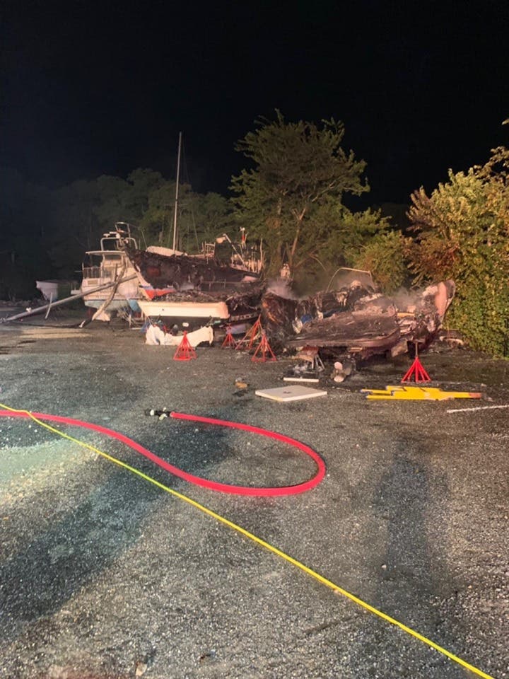 MATTITUCK, NY — A fire ripped through four boats in the boat yard at Strong's Water Club & Marina in Mattituck early Tuesday, police and firefighters said.