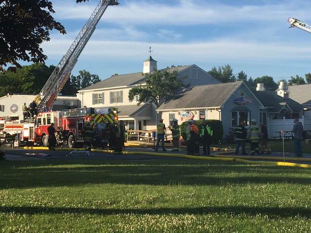 Cutchogue Fire Department Chief Thomas Shalvey Jr. said the fire broke out in the back storage building of the business; the roof collapsed on that structure and the building — as well as the store and restaurant — sustained water damage, he said. One fire department member was treated for heat exhaustion, he said.